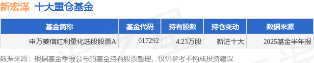 根据2025基金半年报公募基金重仓股数据,重仓该股的公募基金共1家,其中持有数量最多的公募基金为申万菱信基金的申万菱信红利量化选股股票A。申万菱信红利量化选股股票A目前规模为0.13亿元,最新净值1.1464(10月13日),较上一交易日下跌0.59%,近一年上涨9.81%。该公募基金现任基金经理为刘敦 夏祥全。刘敦在任的基金产品包括:申万菱信沪深300指数增强A,管理时间为2019年4月18日至今,期间收益率为48.69%;申万菱信量化对冲策略灵活配置混合发起式A,管理时间为2020年3月25日至今,期间收益率为15.72%;申万菱信中证500指数优选增强A,管理时间为2020年4月15日至今,期间收益率为72.22%;申万菱信中证1000指数增强A,管理时间为2023年2月14日至今,期间收益率为26.8%。夏祥全在任的基金产品包括:申万菱信量化对冲策略灵活配置混合发起式A,管理时间为2020年10月21日至今,期间收益率为10.48%;申万菱信中证1000指数增强A,管理时间为2023年2月14日至今,期间收益率为26.8%;申万菱信量化小盘股票(LOF)C,管理时间为2025年8月11日至今,期间收益率为7.8%。