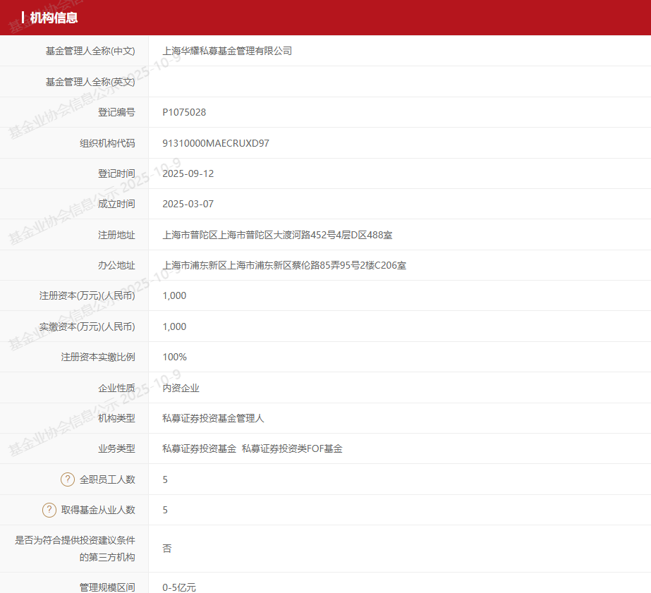 (8)上海华耀上海华耀成立于2025年3月7日,9月12日通过备案登记。法定代表人李光担任华耀私募法定代表人、董事总经理及投资总监。此前,李光就职于昔日百亿量化私募磐松资产。李光2022年11月加入上海磐松,任副总经理兼投资总监;2025年1月至5月转任基金经理,2025年5月离职并创办上海华耀。