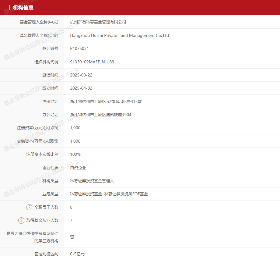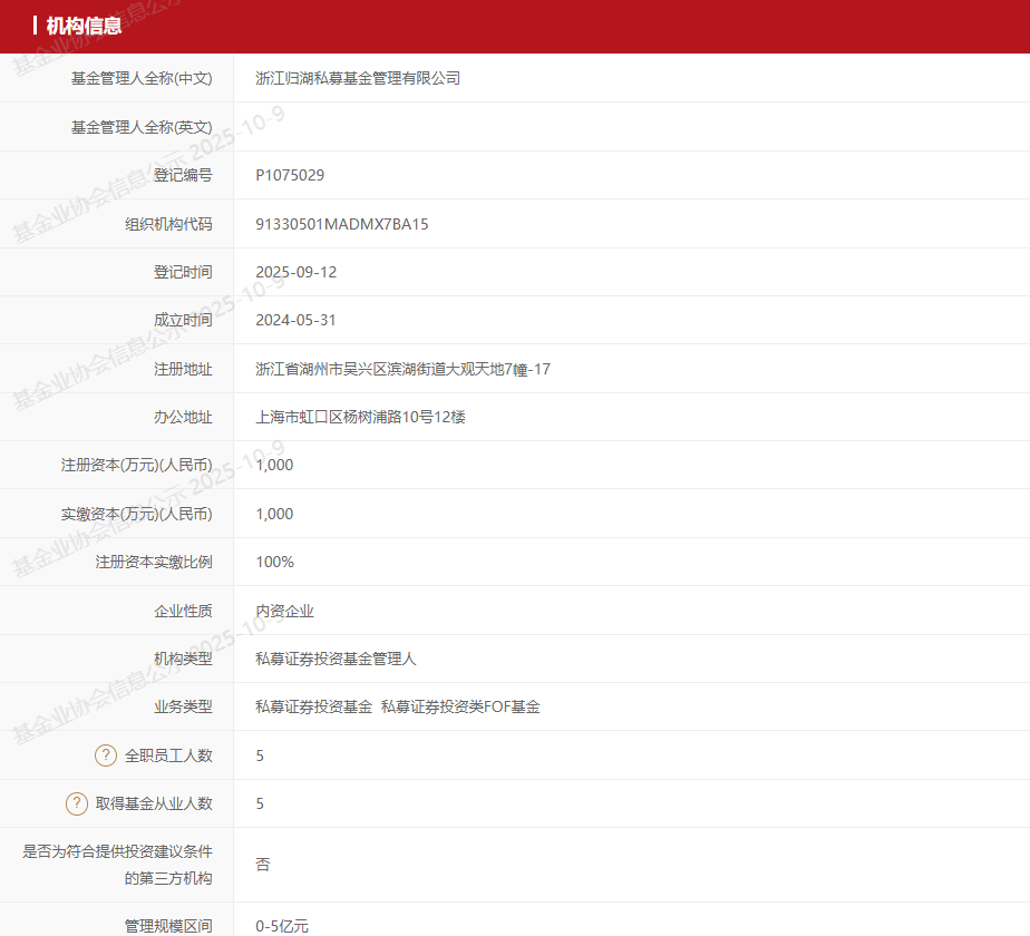 浙江归湖私募成立于2024年5月31日,2025年9月12日完成备案登记,公司法定代表人/实际控制人为吴迪。持股股东包括吴迪 46%、布占营25%、孙艳军14%、晓宁15%。