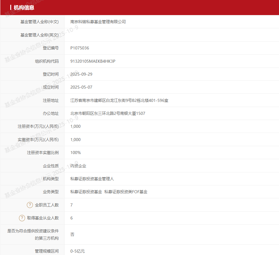 南京科锘成立于2025年5月7日,2025年9月29日通过私募证券投资基金管理人登记。南京科锘的出资人分别是徐志翔、王皓、方铭涛与向伟。其中徐志翔持有股份40%,为公司第一大股东与实控人;王皓持有37%的股份;方铭涛持有18%的股份;向伟持有5%的股份。