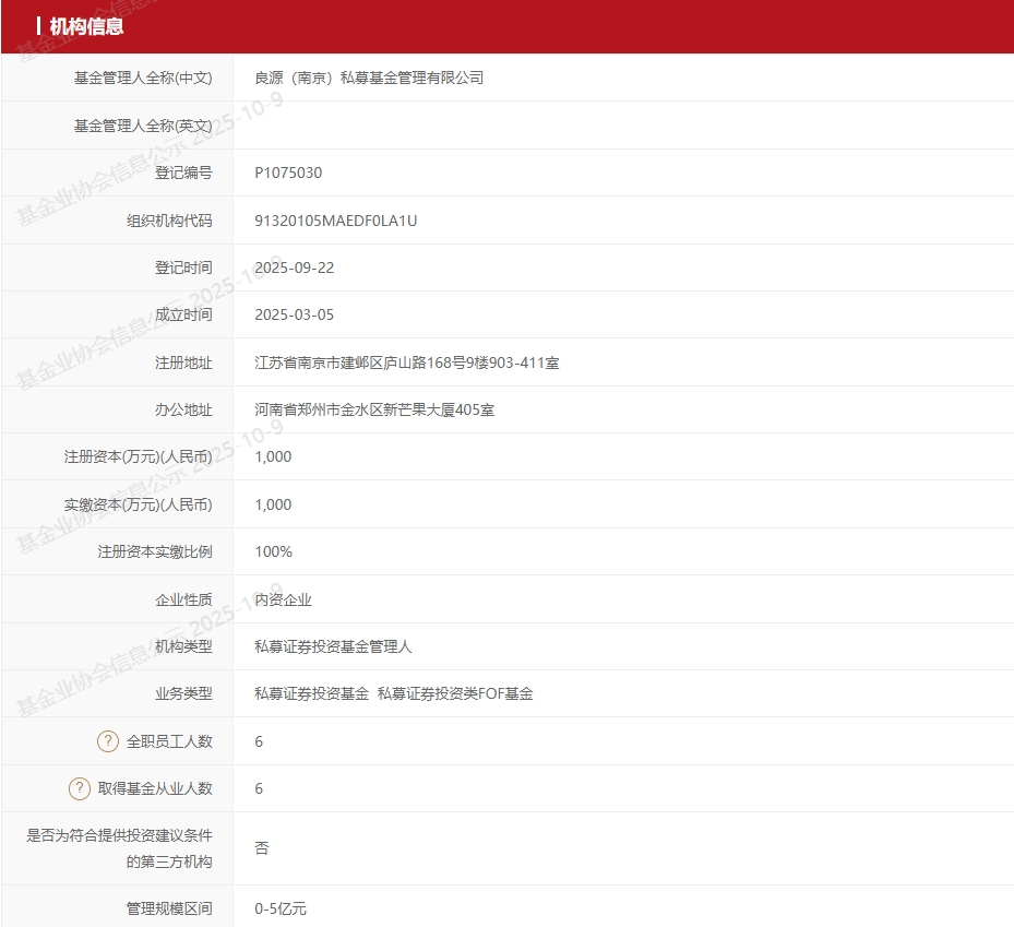 南京良源成立于2025年3月5日,9月22日正式完成登记。该公司注册地址在南京,而办公地址却设在河南省郑州市金水区。