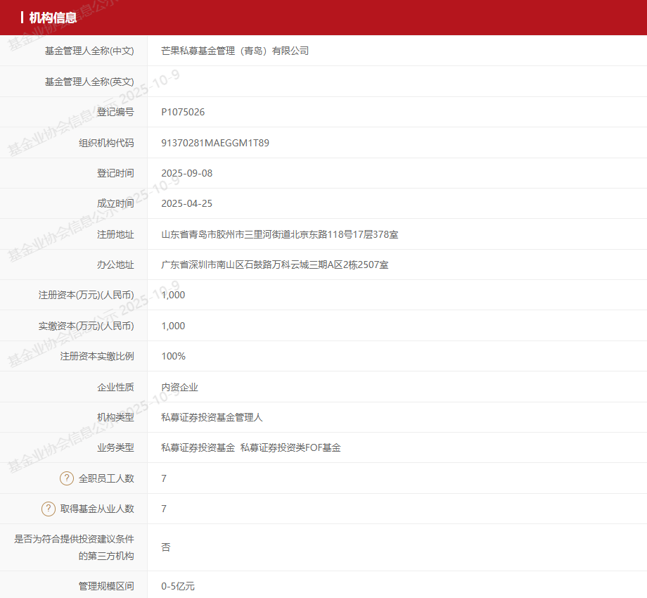 芒果私募9月8日通过协会备案,注册地青岛,办公地深圳,法定代表人王上。王上早期在远澜信息科技担任研究员,2013年成立了弈倍投资,担任法定代表人、执行董事、基金经理。2013.6—2025.5的12年时间里,相继担任弈倍投资法定代表人、执行董事、基金经理,直至2025年4月成立芒果私募。