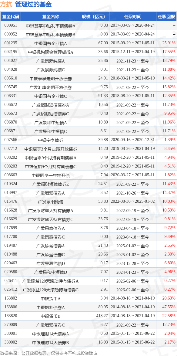 方抗(FANGKang)先生:中银基金管理有限公司助理副总裁(AVP),经济学硕士,持有中国证券投资基金业从业证书。曾任交通银行总行金融市场部授信管理员,南京银行总行金融市场部上海分部销售交易团队主管。2013年加入中银基金管理有限公司,曾任固定收益基金经理助理。2018年3月至今任中银泰享基金基金经理,具备基金从业资格。曾任中银增利基金基金经理、中银国有企业债基金基金经理、中银理财90天债券基金基金经理、中银康享基金经理、中银恒裕9个月持有期债券型证券投资基金的基金经理、中银货币基金基金经理、中银机构现金管理货币市场基金基金经理、中银泰享定期开放债券型发起式证券投资基金基金经理、中银同享一年定期开放债券型发起式证券投资基金基金经理。2021年9月22日任广发增强债券型证券投资基金、广发汇康定期开放债券型发起式证券投资基金、广发招财短债债券型证券投资基金、广发景和中短债债券型证券投资基金的基金经理。2021年11月23日起任广发景源纯债债券型证券投资基金基金经理。广发景阳纯债债券型证券投资基金基金经理(自2022年8月30日至2025年1月2日任职)、广发添财60天持有期债券型证券投资基金基金经理(自2022年9月19日起任职)、广发景泰债券型证券投资基金基金经理(自2023年4月18日起任职)、广发添盈债券型证券投资基金基金经理(自2025年1月2日起任职)。