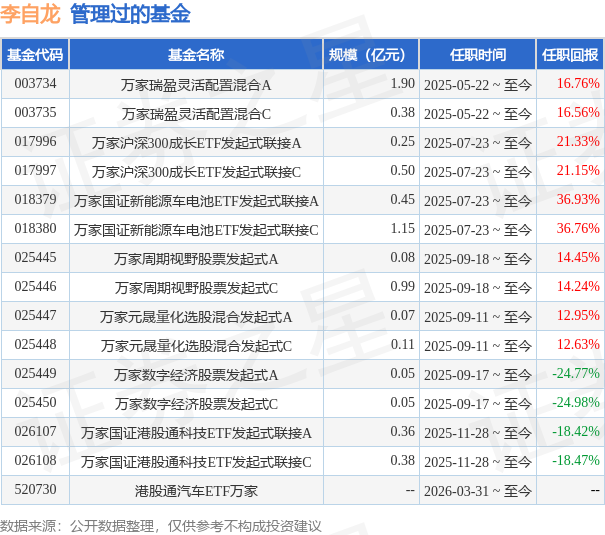 李自龙先生:中国国籍,复旦大学理论物理专业博士。曾任通联数据股份公司金融工程部量化研究员,上海鹤骑鹰投资管理有限公司投资研究部量化研究员,东兴期货有限责任公司投资咨询部研究员等职。2020年4月入职万家基金管理有限公司,现任量化投资部基金经理,历任量化投资部投资经理助理、投资经理。2025年5月22日担任万家瑞盈灵活配置混合型证券投资基金基金经理。2025年7月23日起担任万家沪深300成长交易型开放式指数证券投资基金发起式联接基金、万家国证新能源车电池指数型发起式证券投资基金基金经理。2025年9月11日担任万家元晟量化选股混合型发起式证券投资基金基金经理。2025年09月17日担任万家数字经济股票型发起式证券投资基金基金经理。2025年09月18日担任万家周期视野股票型发起式证券投资基金基金经理。2025年11月08日担任万家国证港股通科技交易型开放式指数证券投资基金发起式联接基金基金经理。