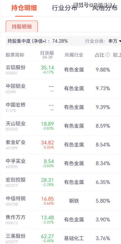 该基金前十大持仓中云铝股份、中国铝业、天山铝业、中孚实业跌幅较大,前十持仓占总持仓的74.28%,基金风格偏向有色金属行业。基金净值相对跑输市场(属于有色金属行业偏向铝金属资源方向方向的主动型混合基金)【基金规模0.35亿元】。