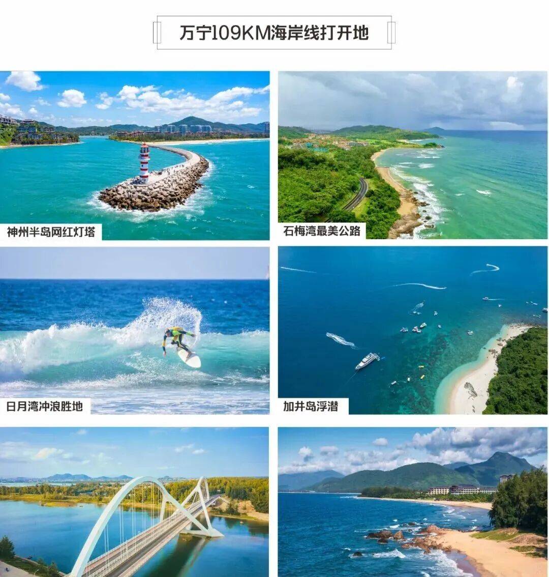 万宁享有丰富的滨海旅游资源,这里也是名副其实的海上运动的天堂!在109公里的海岸线个风景秀丽的半岛;近年来投入使用的日月湾冲浪、石梅湾游艇、港北龙舟、港北海钓、水上飞机5大基地,备受国内外赛事组织的青睐,更是国内外游客享受海上运动的极佳去处。