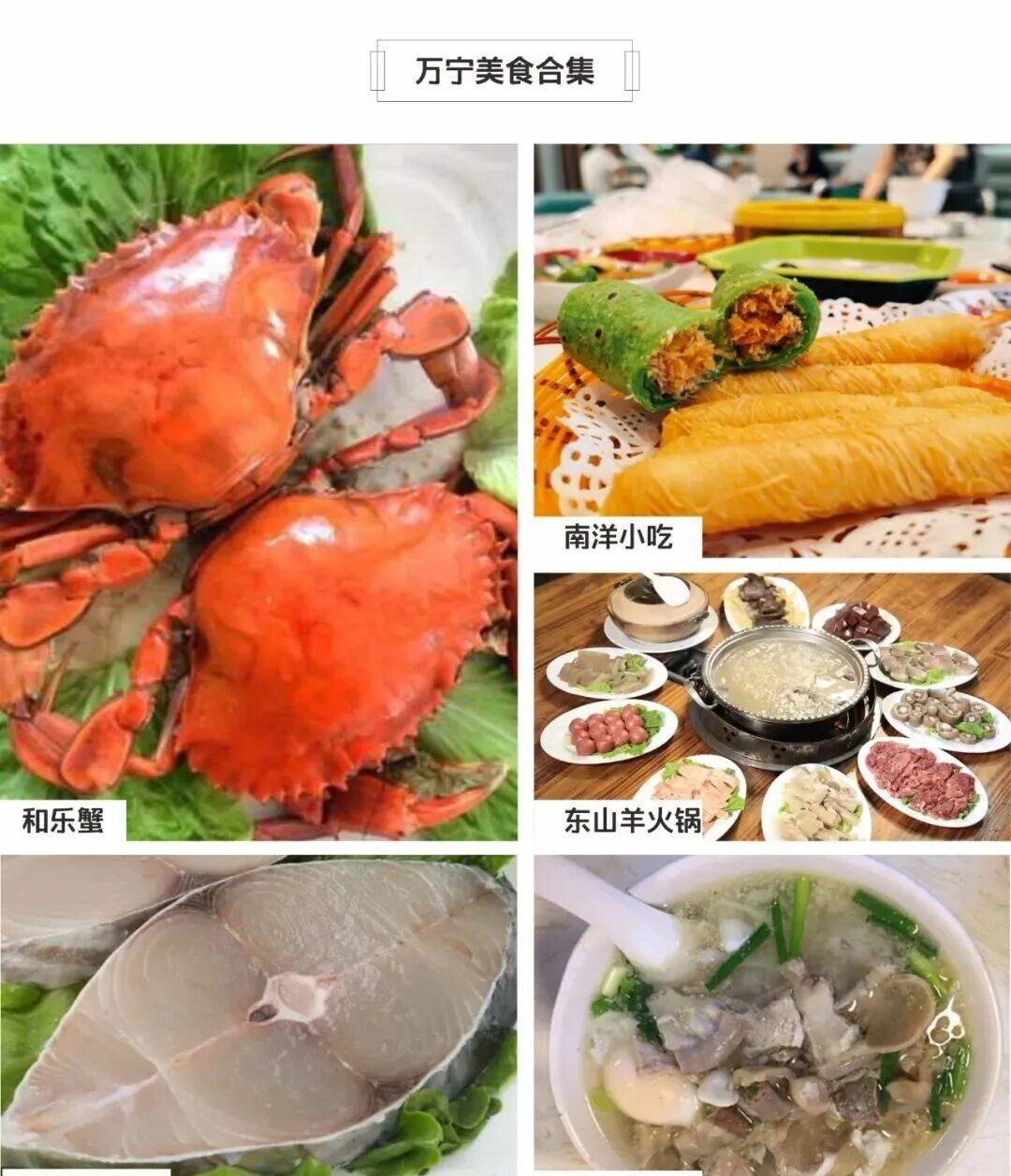 万宁也是海内外吃货的天堂。海南四大名菜,万宁占据2大菜系,东山羊、和乐蟹,还有各种进出口海鲜鱼类马鲛鱼、章雄鱼、以及南洋小吃、椰子粑粑、万宁粉汤、等特色小吃,也能让你大快朵颐。