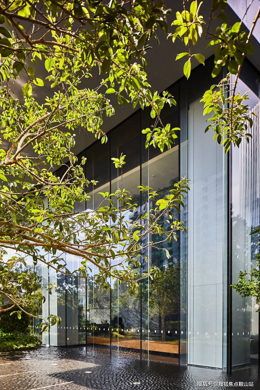与一楼大堂的空间延伸。这是很聪明的设计,有效的“拉阔了”私家园林的空间力量,约10.2m极致挑⾼⼤堂与超白玻璃的应用,模糊了室内外的边界,亦待大堂亦待园林感。颇有些迈阿密酒店和顶豪生活气场。▽