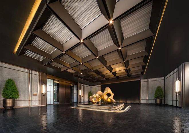 一座宽约28米(含景墙超100米),高约6.3米的大气门楼,超约420㎡车马院配合顶部鎏金格纹重顶,叠加白世贸+范思哲黑石材+质感金属+福鼎黑石地铺,结合最新一代“无雨环岛落客区”,在私域与外界之间,划分出鲜明的领域感。